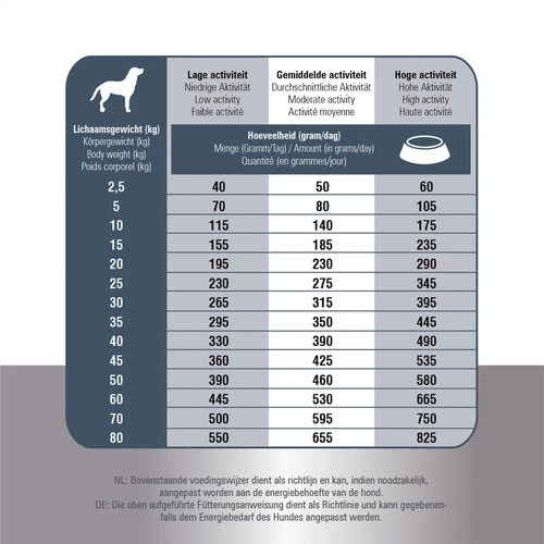 Getreide, Fleisch und tierische Nebenerzeugnisse (16,5% dehydriertes Huhn, 7% dehydrierter Lachs, 100 mg Glucosamin, 100 mg Chondroitin), pflanzliche Nebenerzeugnisse, Öle und Fette (Lachsöl 0,1%), Hefe