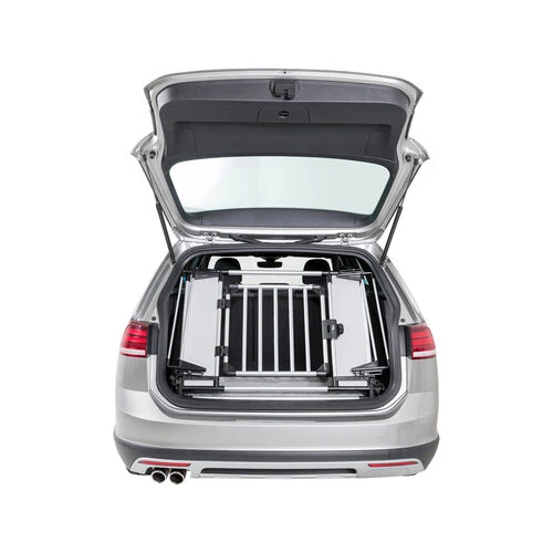 Mit diesem Heckgitter kann der gesamte Kofferraum als Liegefläche von Ihrem Hund genutzt werden. Die Bodenplatte ist mit Klettfüßen ausgestattet, die das gesamte Gitter fest an seinem Platz halten. Die rutschfeste Liegematte ist maschinenwaschbar bis 30 Grad Celsius. Das Trixie Heckgitter besteht aus den Materialien Aluminium, Hartfaserplatte und Kunststoff und wird mit vier Befestigungshaken geliefert. Die Tür hat auch einen Schlitz für ein Vorhängeschloss, das Schloss selbst ist nicht enthalten. Die Breite ist einstellbar von 94 bis 114 Zentimetern, die Höhe beträgt 69 Zentimeter und die Tiefe 53 Zentimeter. Schauen Sie sich natürlich die Maße Ihres Kofferraums genau an und prüfen Sie, ob er passt. Das Gitter ist für die meisten Autos geeignet.